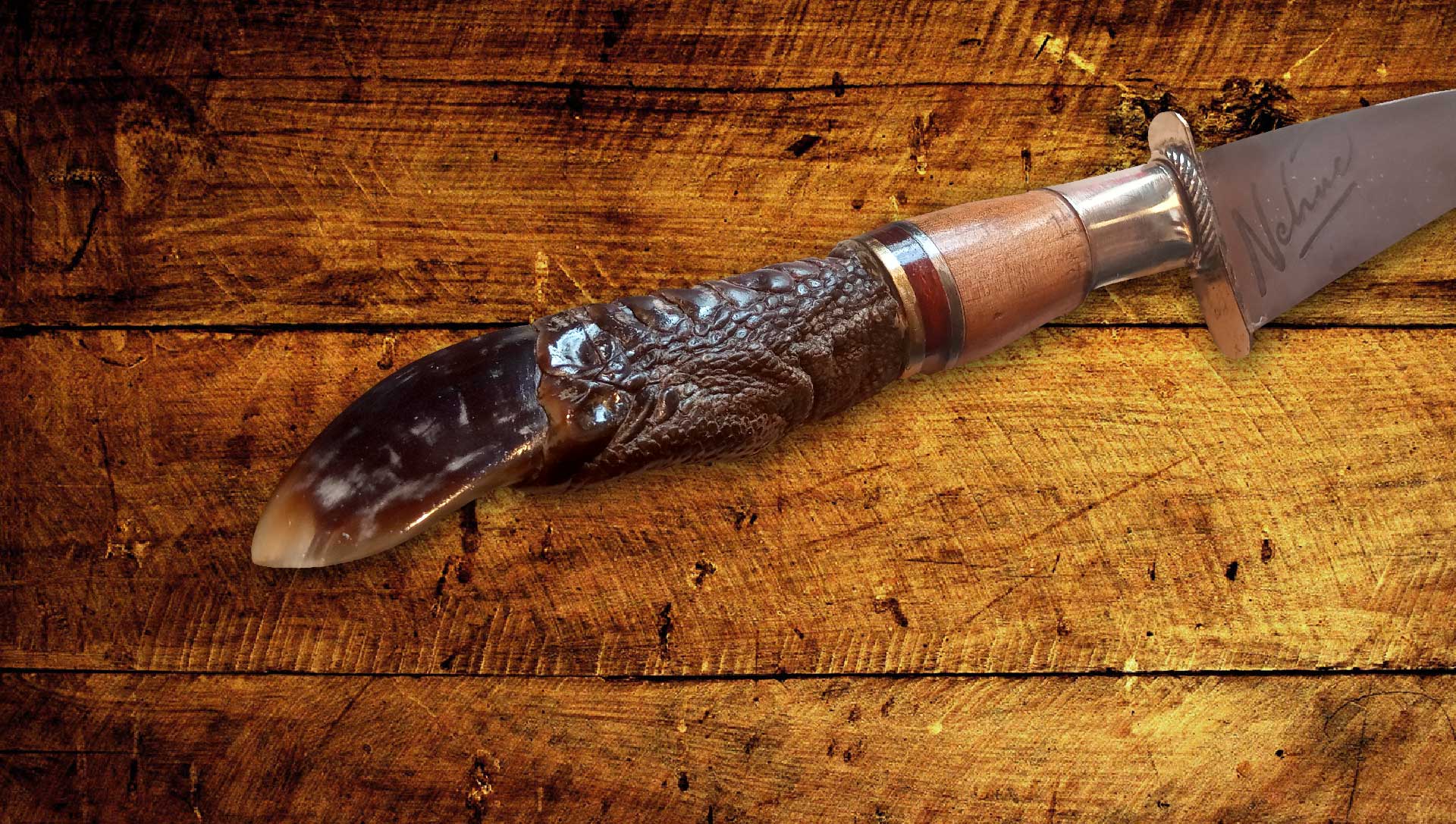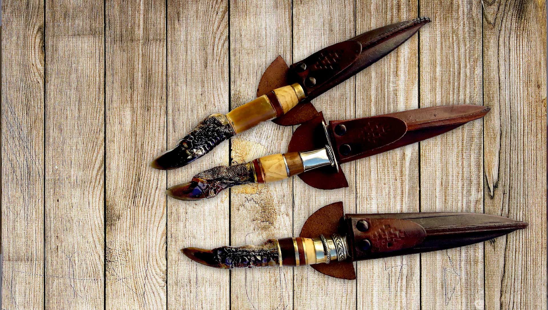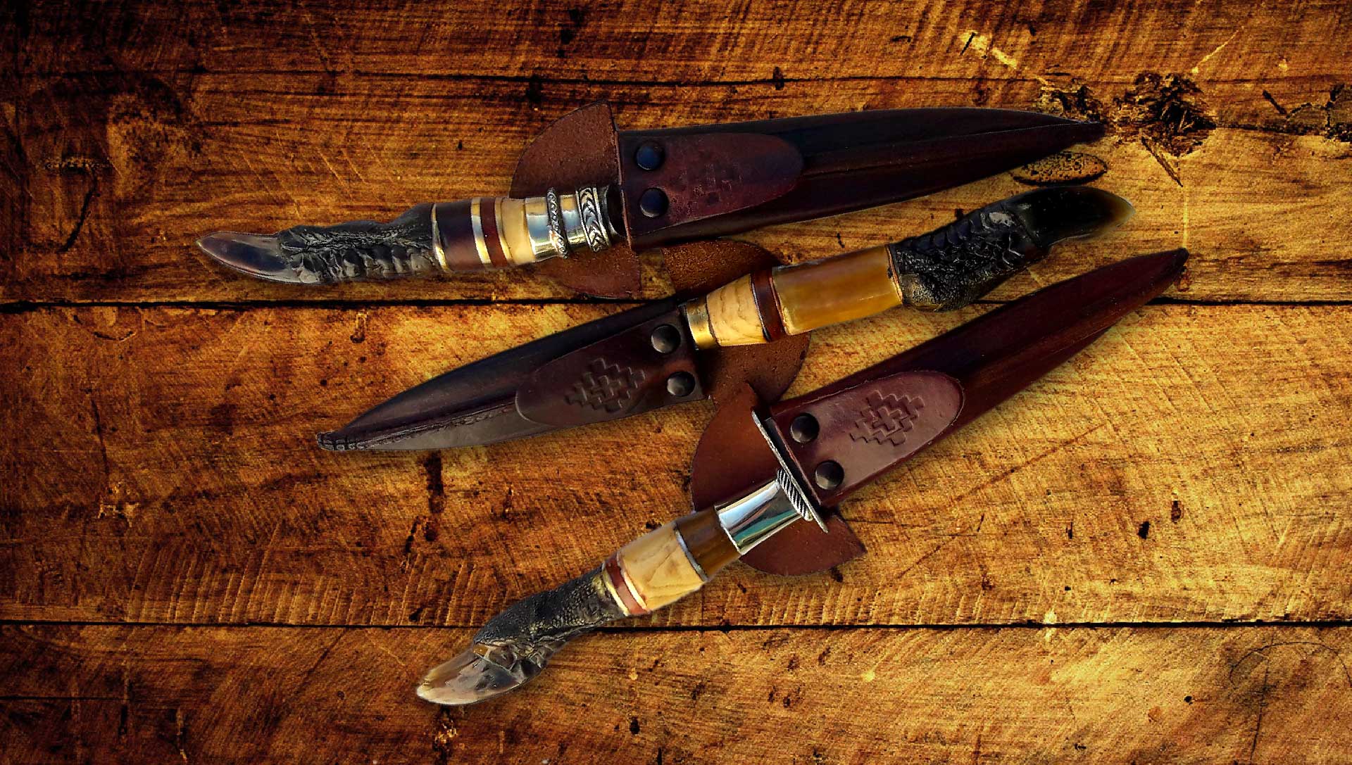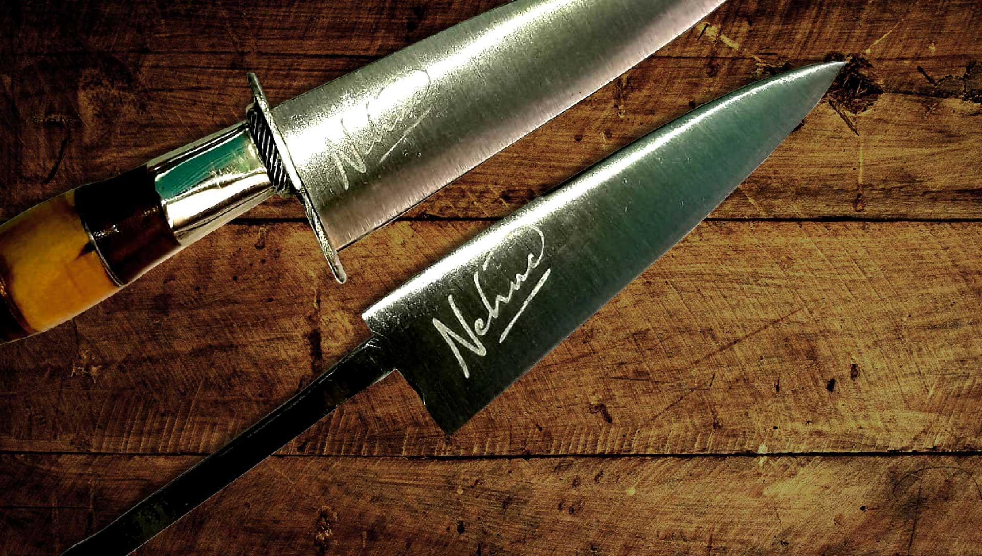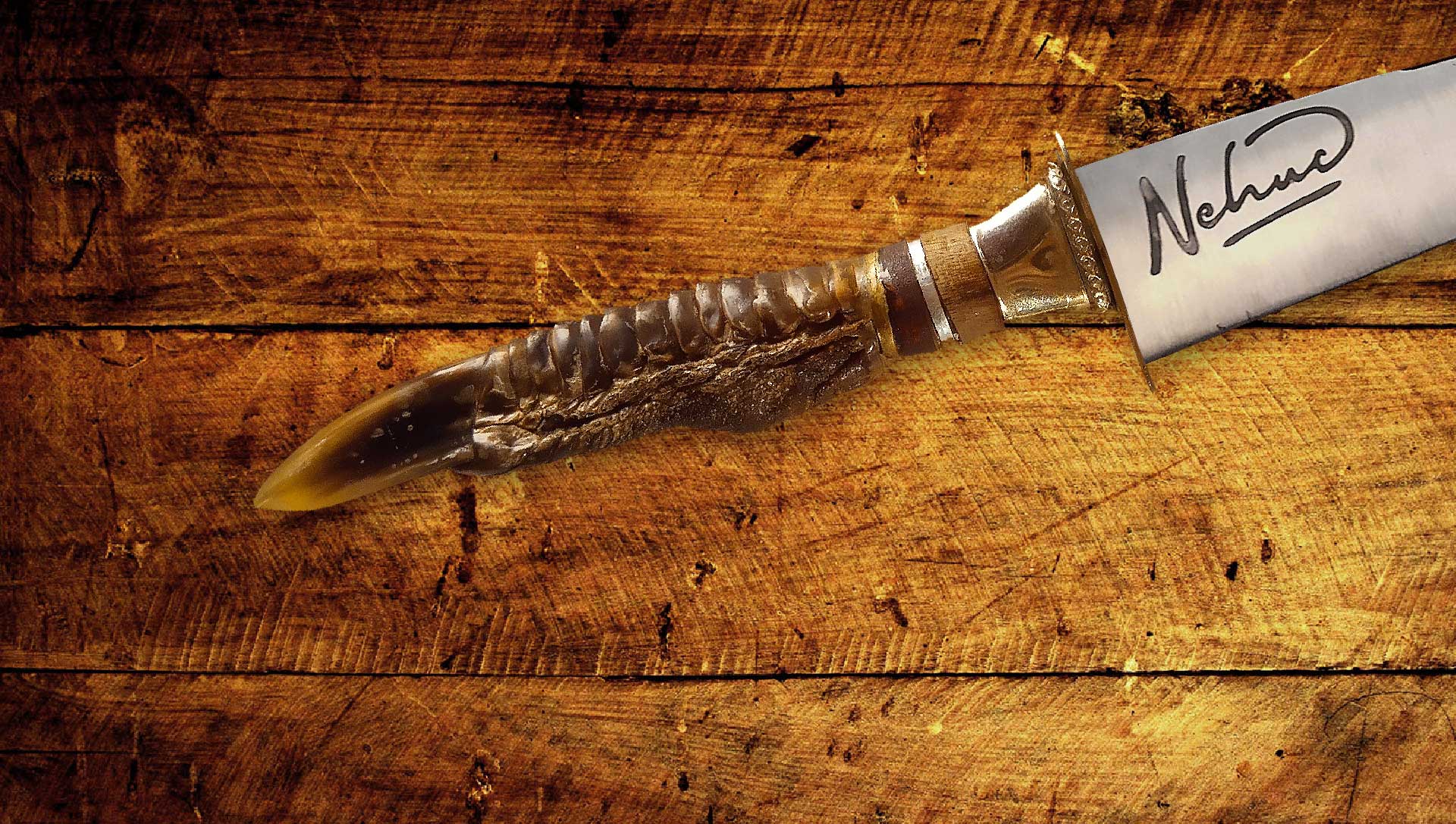 Hechos a mano por el artesano argentino Nestor Hugo Cides Castro. Cada cuchillo viene con una funda de cuero de vaqueta curtido. El tamaño de cada cuchillo de punta a punta -sin funda- es de 25 cms de largo. Las hojas tienen nuestra marca Nehuc© que garantizan su origen.