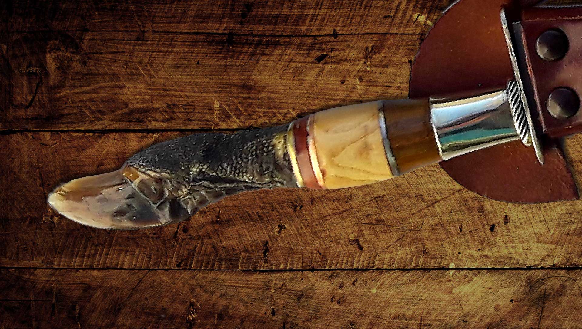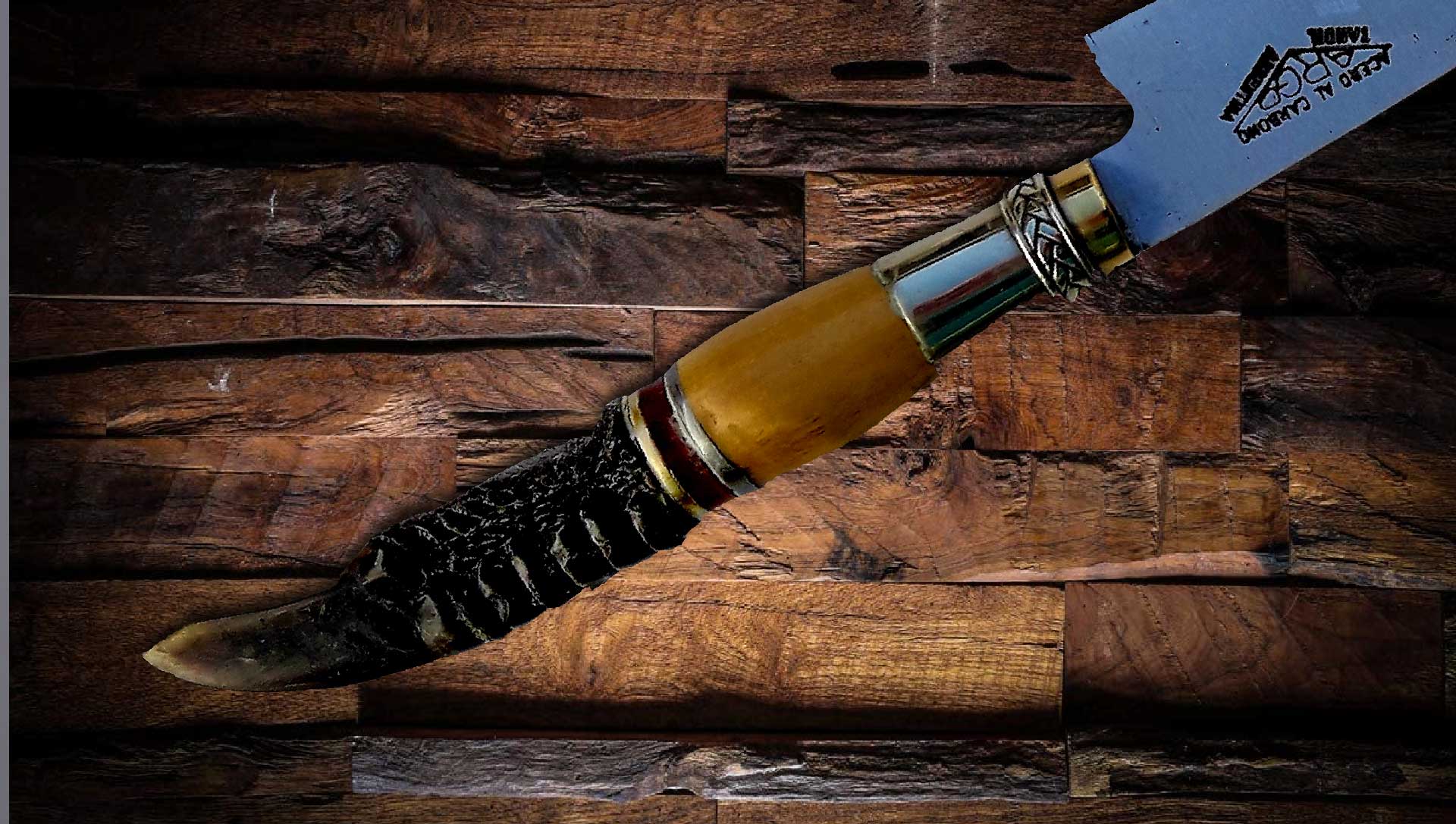 Mango con uña de ñandú argentino de criaderos oficiales, con incrustaciones de madera, alpaca y frizos hechos con monedas argentinas torneadas. Hojas de acero inoxidable de Tandil (Arg.) famosos por su excelencia en la fabricación de acero.